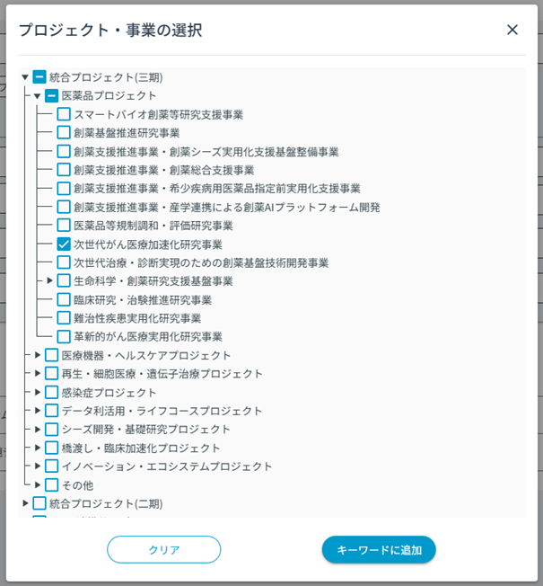 - 子画面から選択して検索条件を設定する方法 子画面から「統合プロジェクト(二期)>医薬品プロジェクト<第二期>>創薬等ライフサイエンス研究支援基盤事業>創薬等先端技術支援基盤プラットフォーム」を選択し、「キーワードに追加」して検索⇒テキストボックスには「"創薬等ライフサイエンス研究支援基盤事業"」が自動で入力され、「統合プロジェクト(二期)>医薬品プロジェクト<第二期>>創薬等ライフサイエンス研究支援基盤事業>創薬等先端技術支援基盤プラットフォーム」の課題がヒットします。